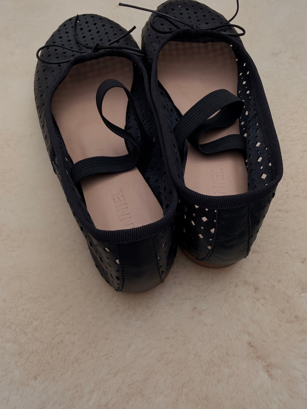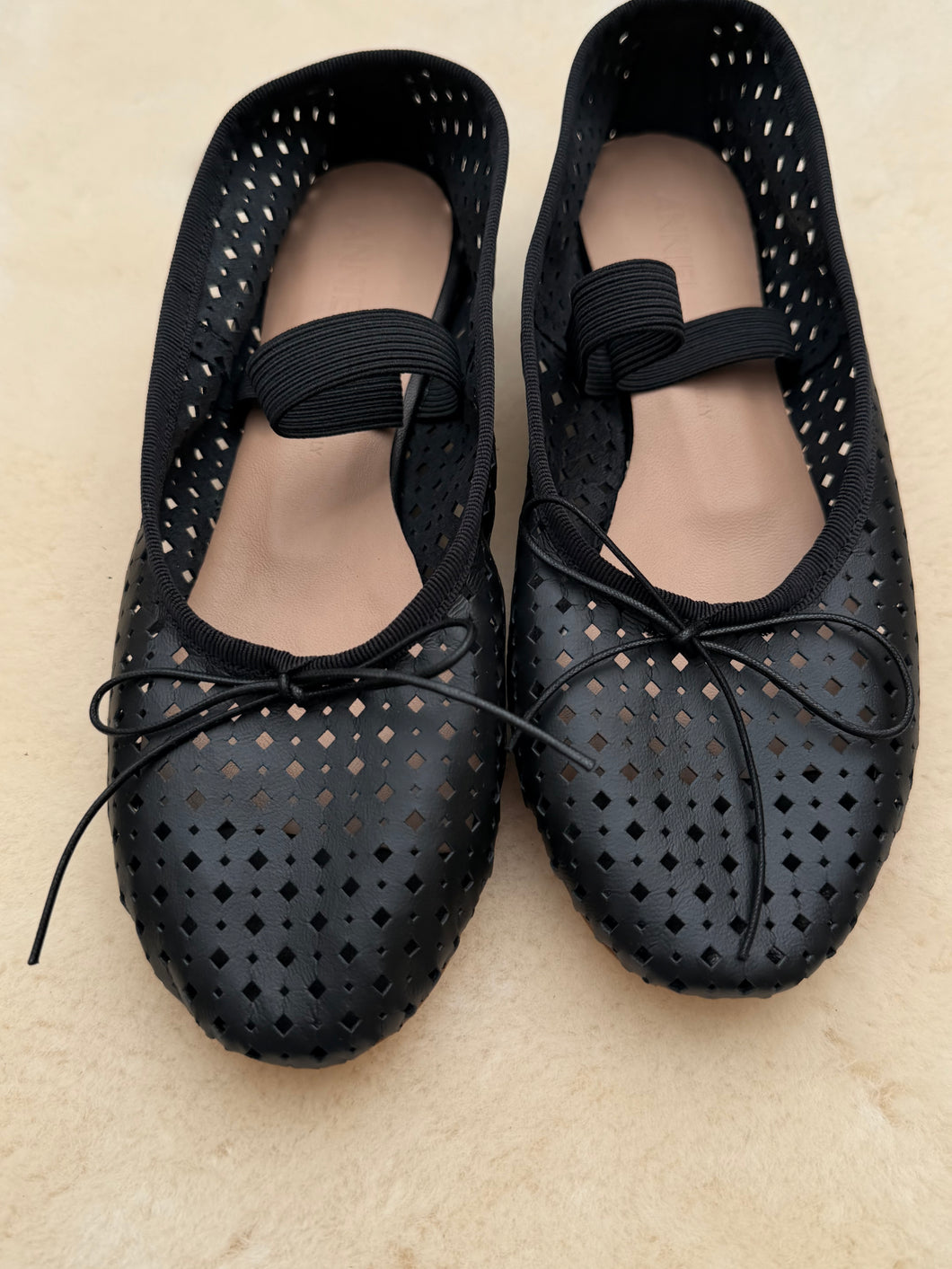 Super cute black leather ballet flat pointelle shoes, leather inner sole and