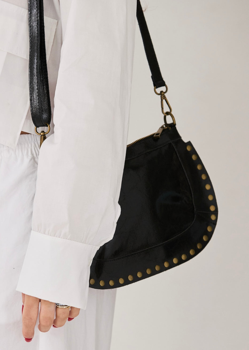 Super stylish small leather studs bag with adjustable strap. It can be worn cross