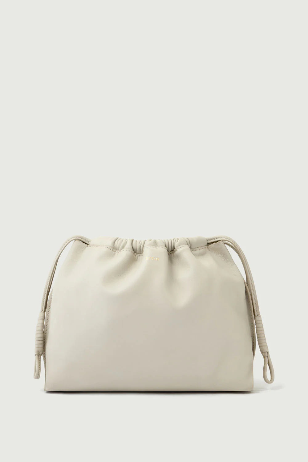 The suzette bag in soft cream-colored leather. It features a single shoulder strap and a drawstring closure system through the handle