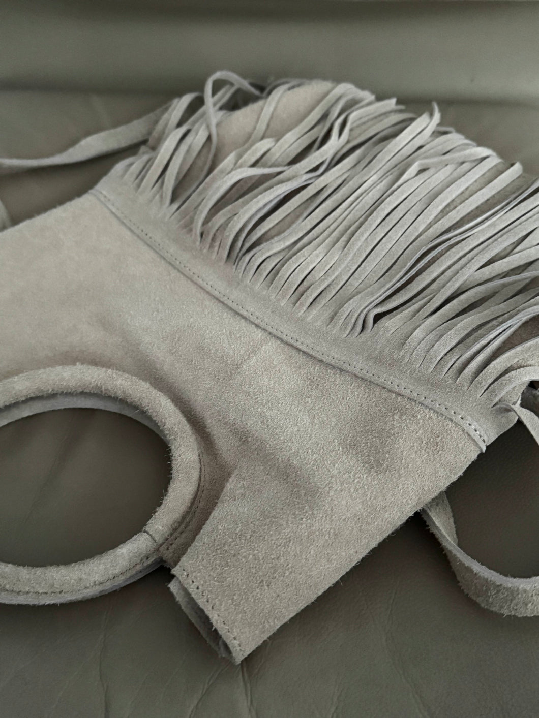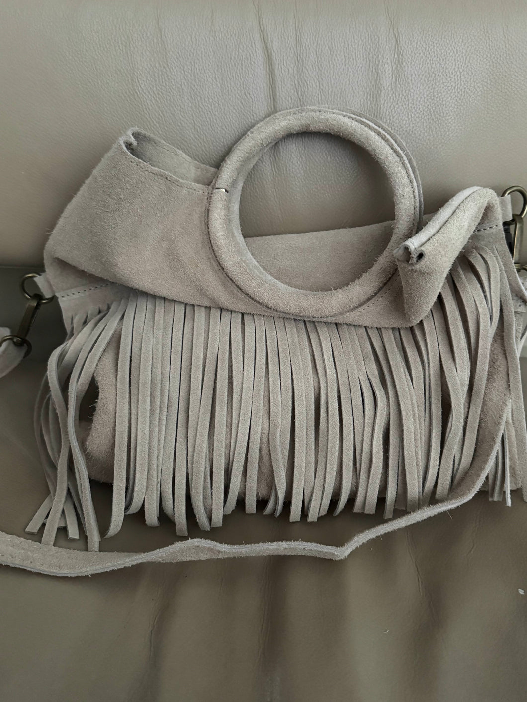 Super stylish small suede bag with adjustable strap and super cute thick circle handle ... incredible and fun fringes details, love it ...super cute It can be worn cross body, slung over the shoulder ....