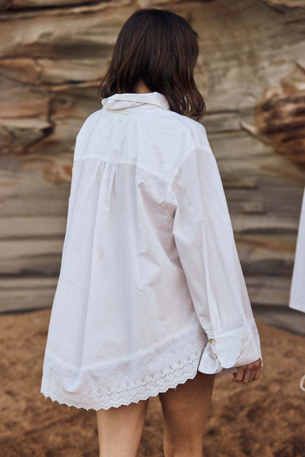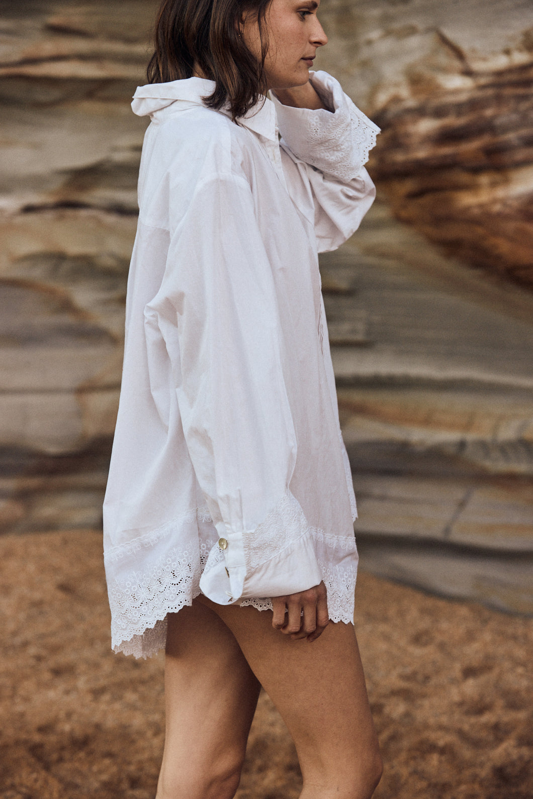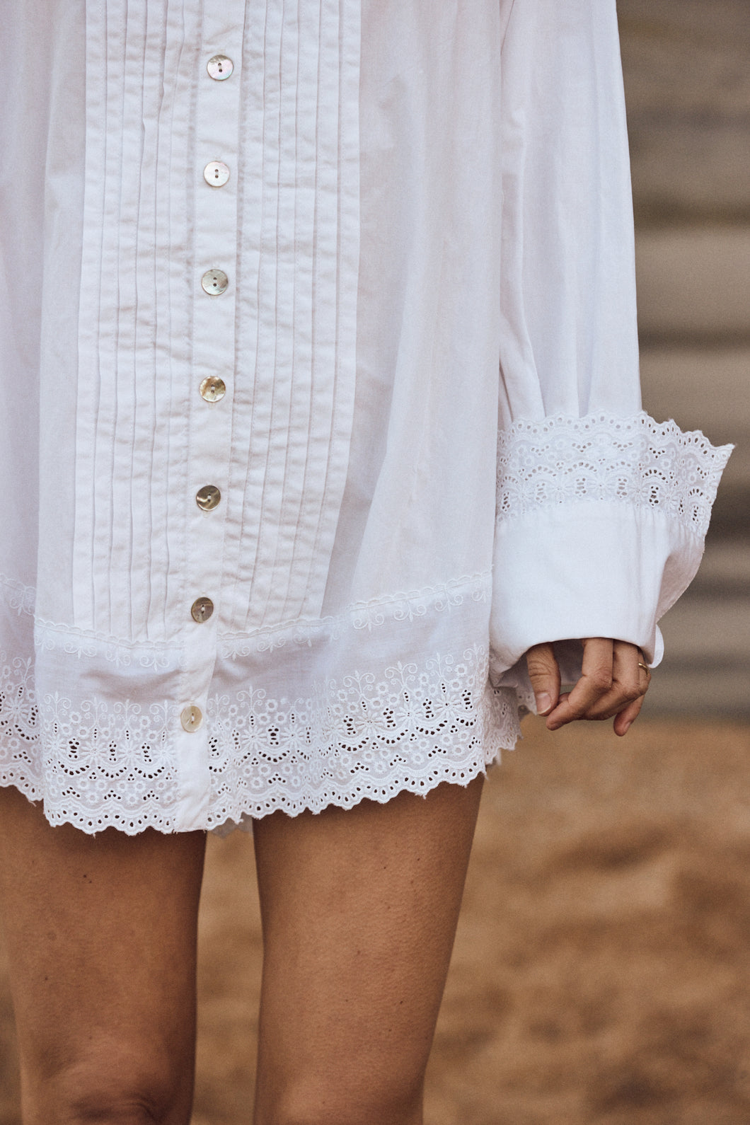 An oversized tunic made of cotton and broderie, front pleat, beautiful detail on edges, with shell buttons