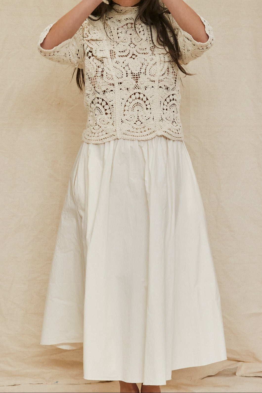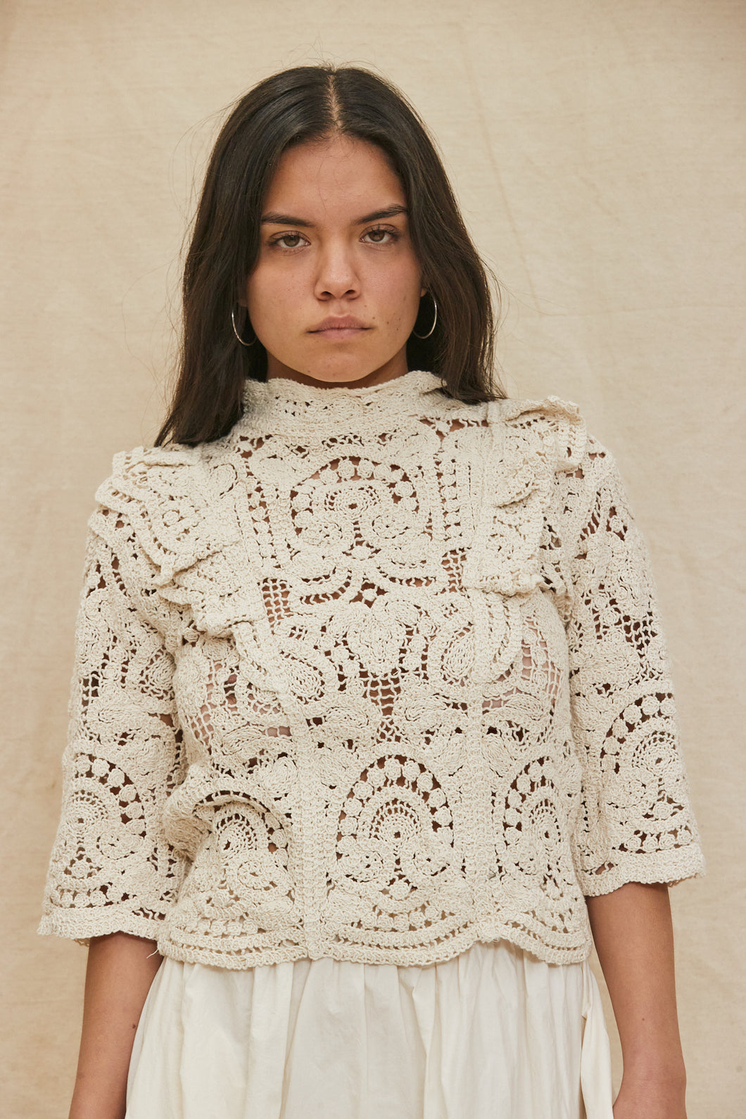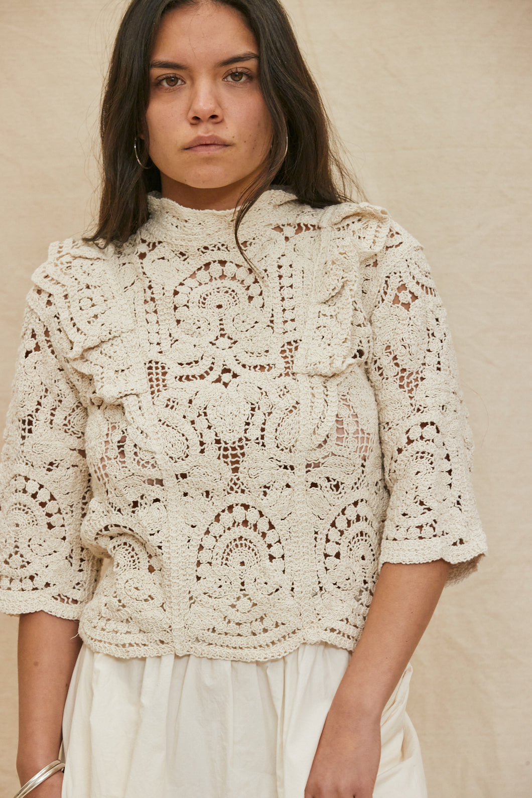 Our crochet blouse, we love it, mid sleeves length, match it with a wide linen pants and a classic leather sandals