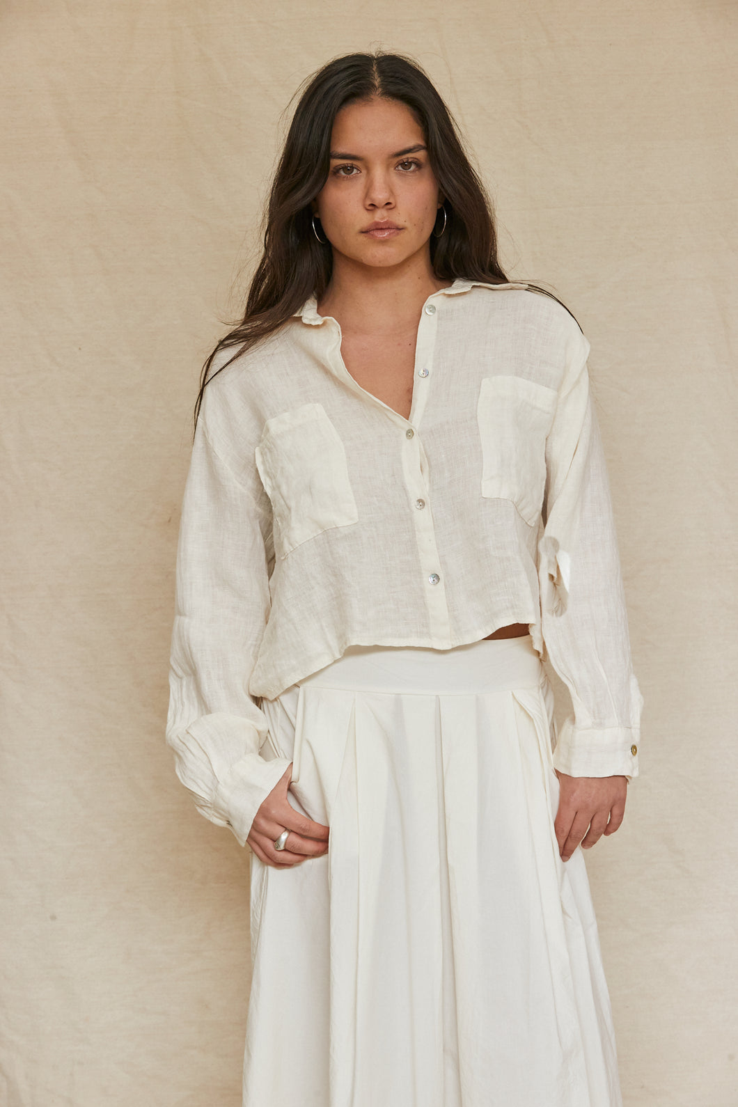 linen short shirt with two chest pockets and shirt collar, shell buttons closure at the front with long sleeves
