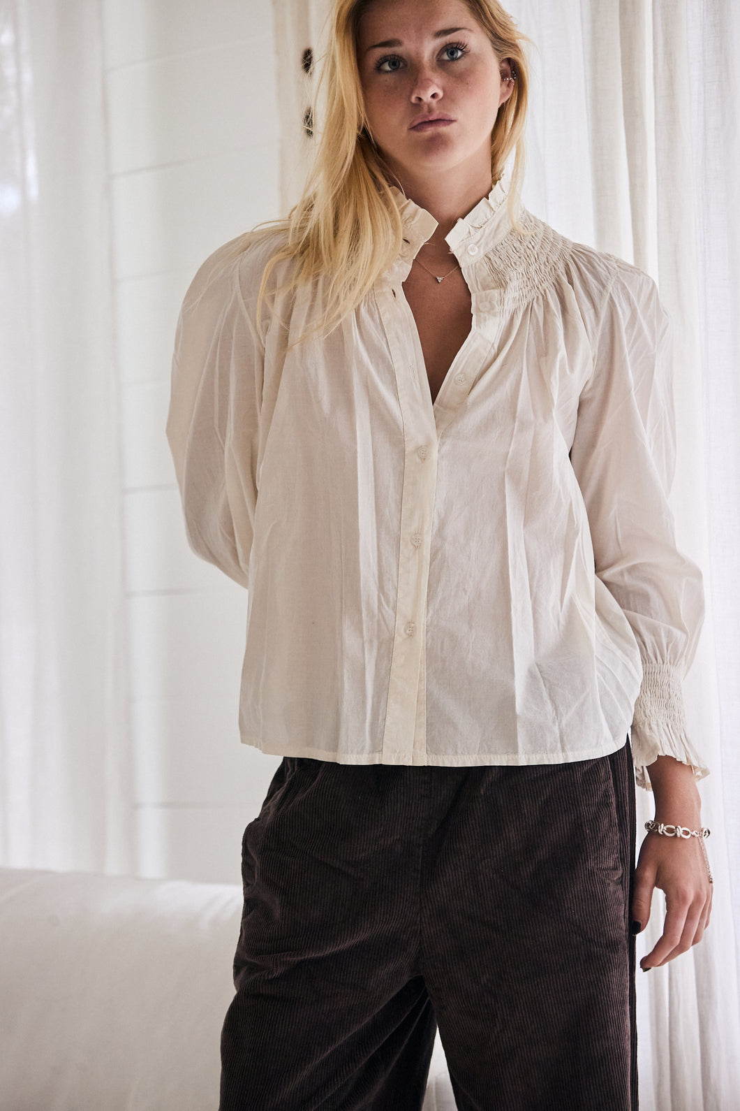 fitted blouse with smoke detail around the neck and ruffle, elasticated smoke armcuff, button closure