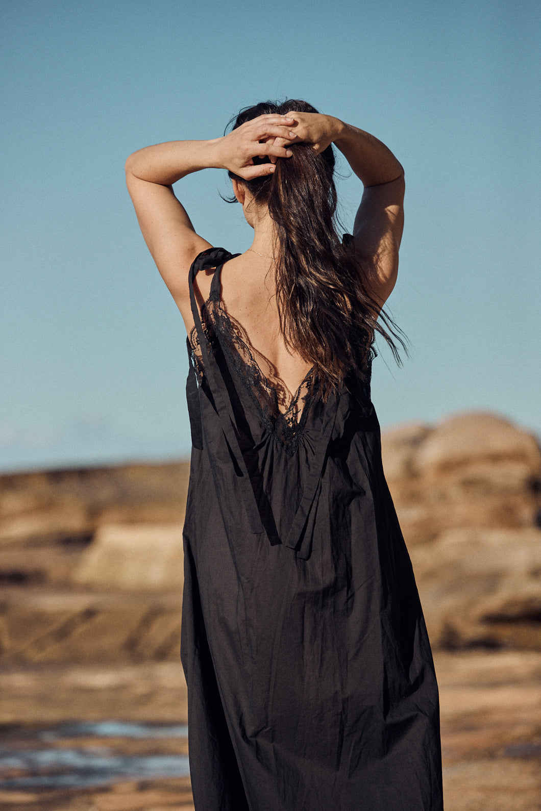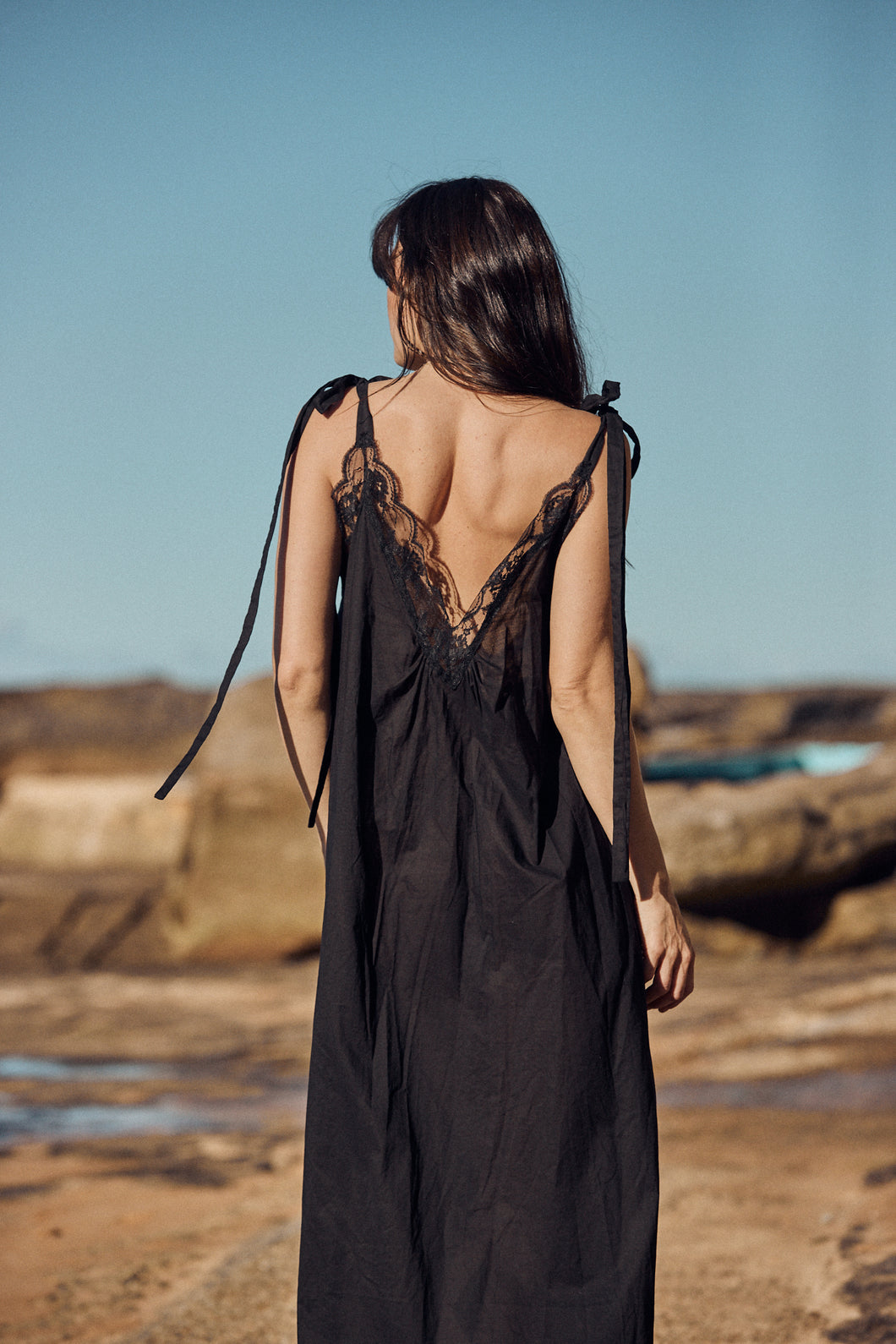 A must, long cotton voile singlet dress, perfect for summer, black with lace details
