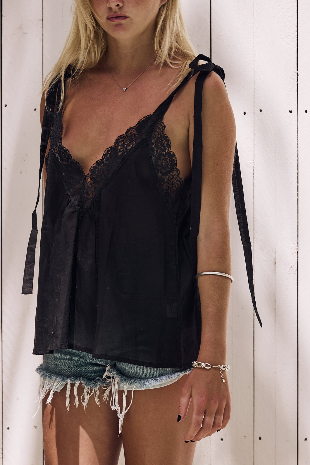 A must, long cotton voile singlet top, perfect for summer, black with lace details