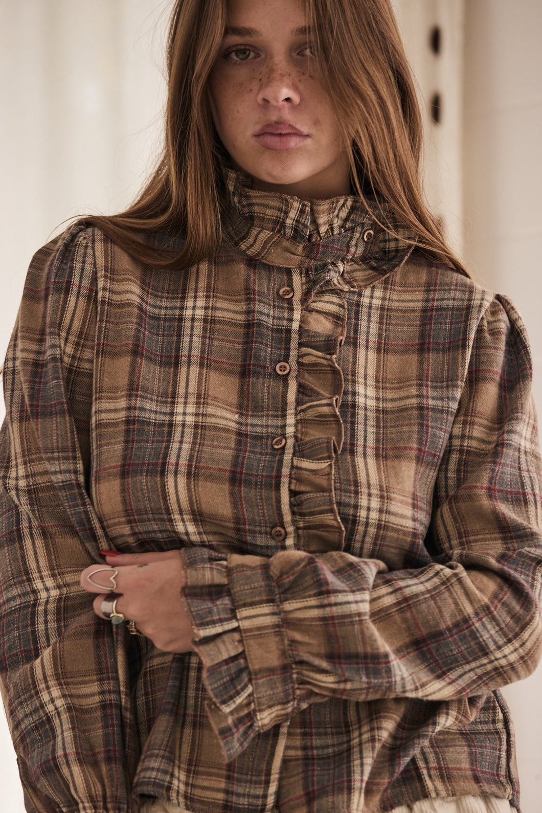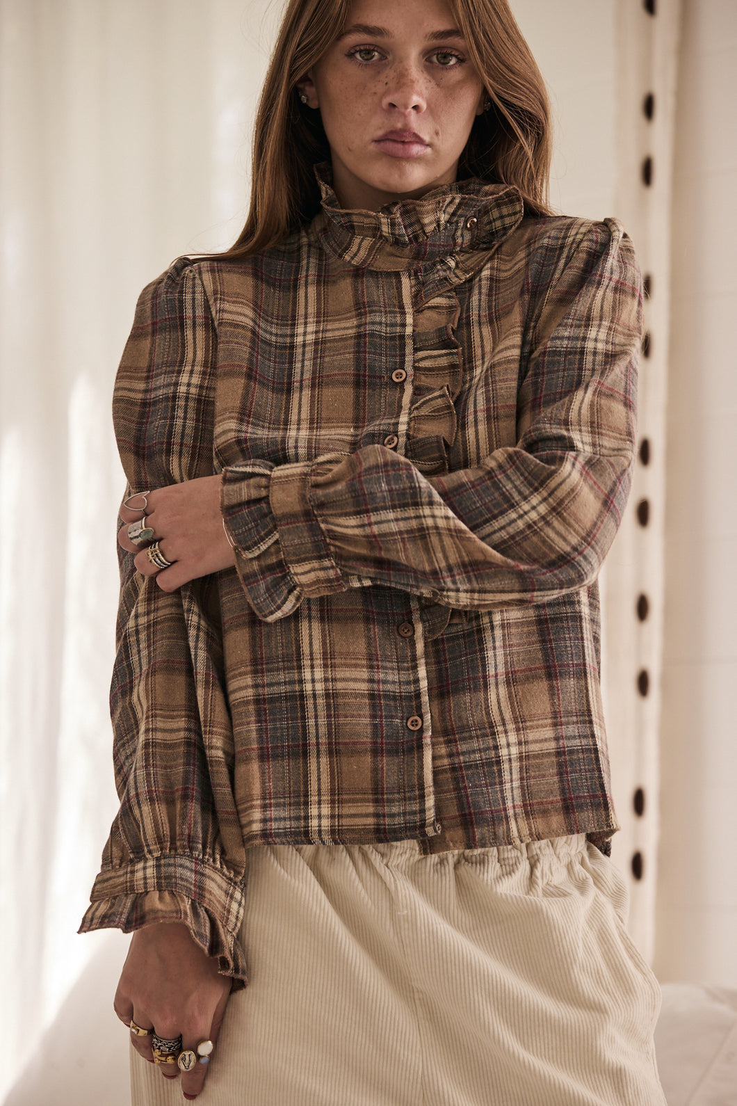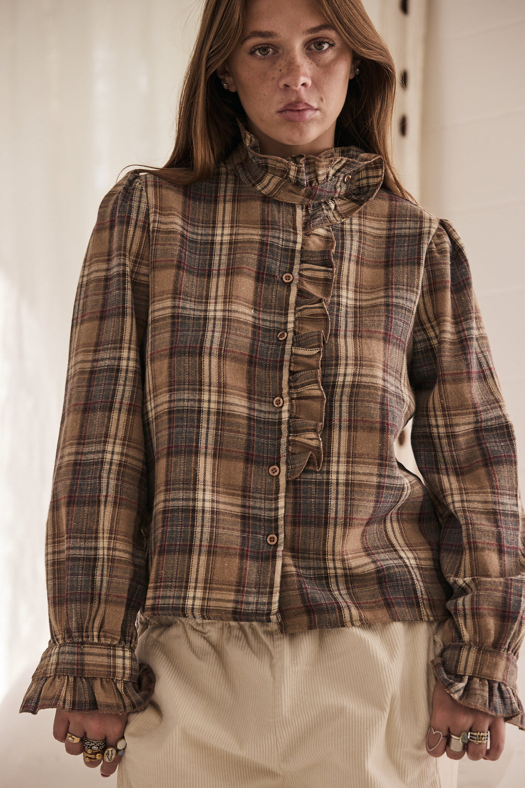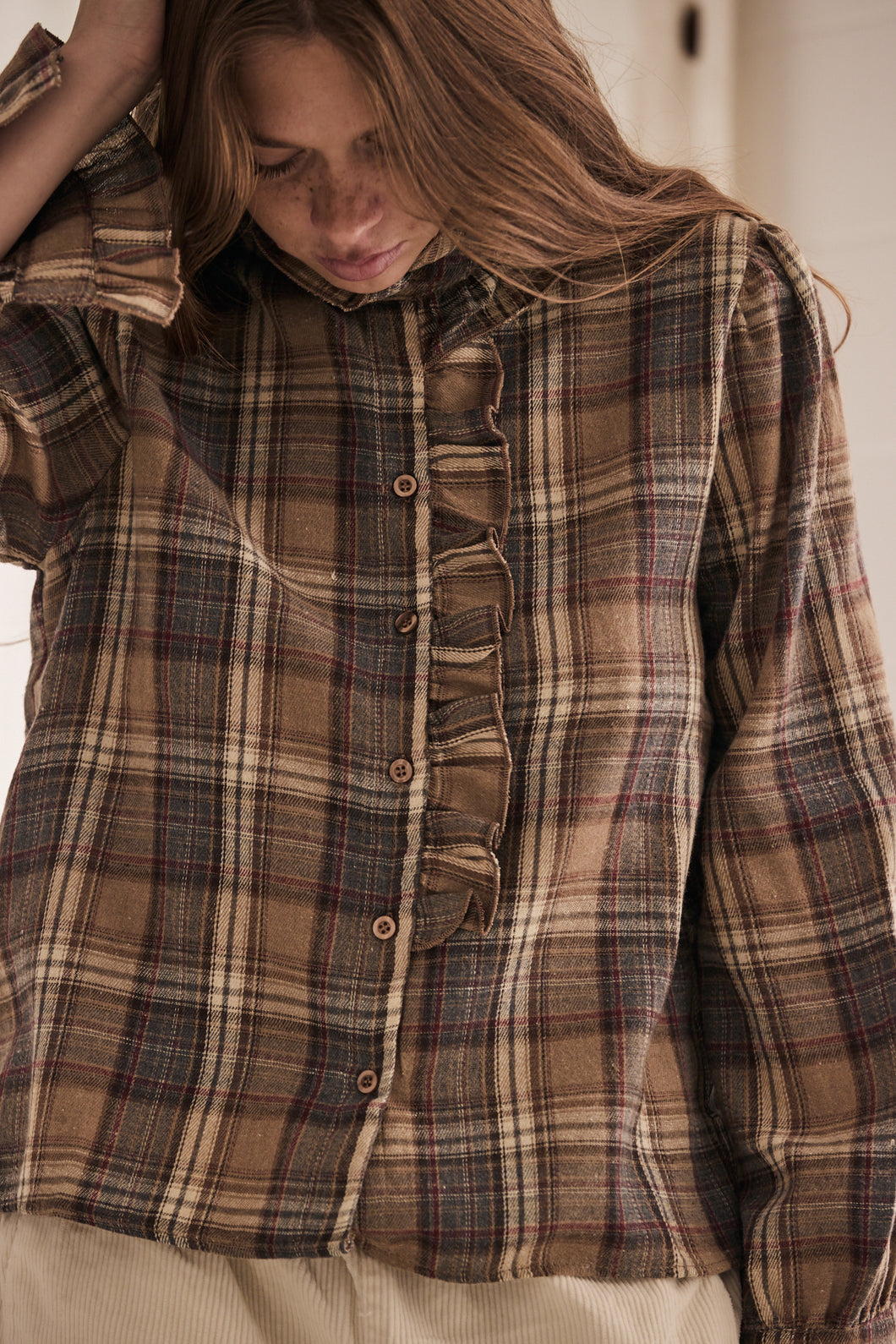 | flannel style fabric, checker blouse with ruffle neckline and ruffle on the arm cuff |
