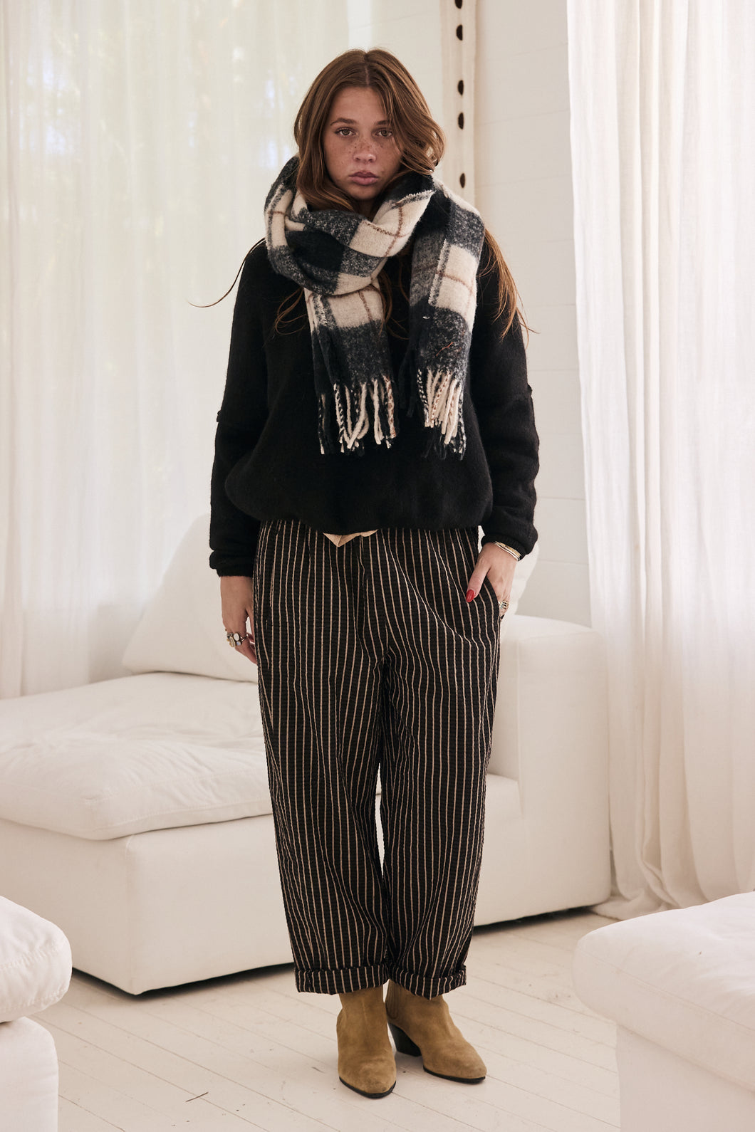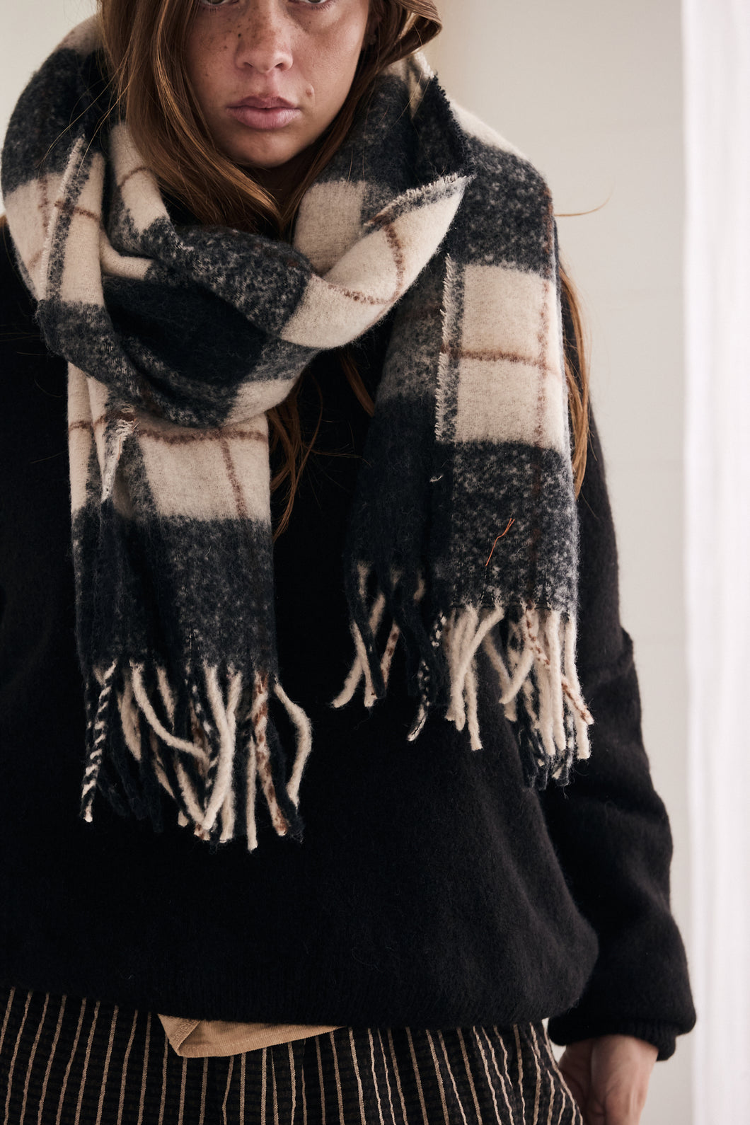 Big checkers scarf super soft with fringes in earthy black, off white and brown stripe...