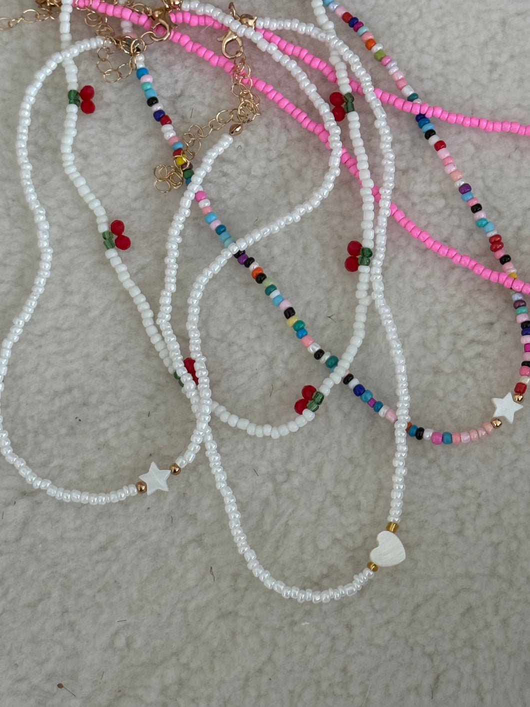 Those lovely bead necklaces are a delight for any kids or adults to wear . The cute little white star or heart are just simply beautiful ....