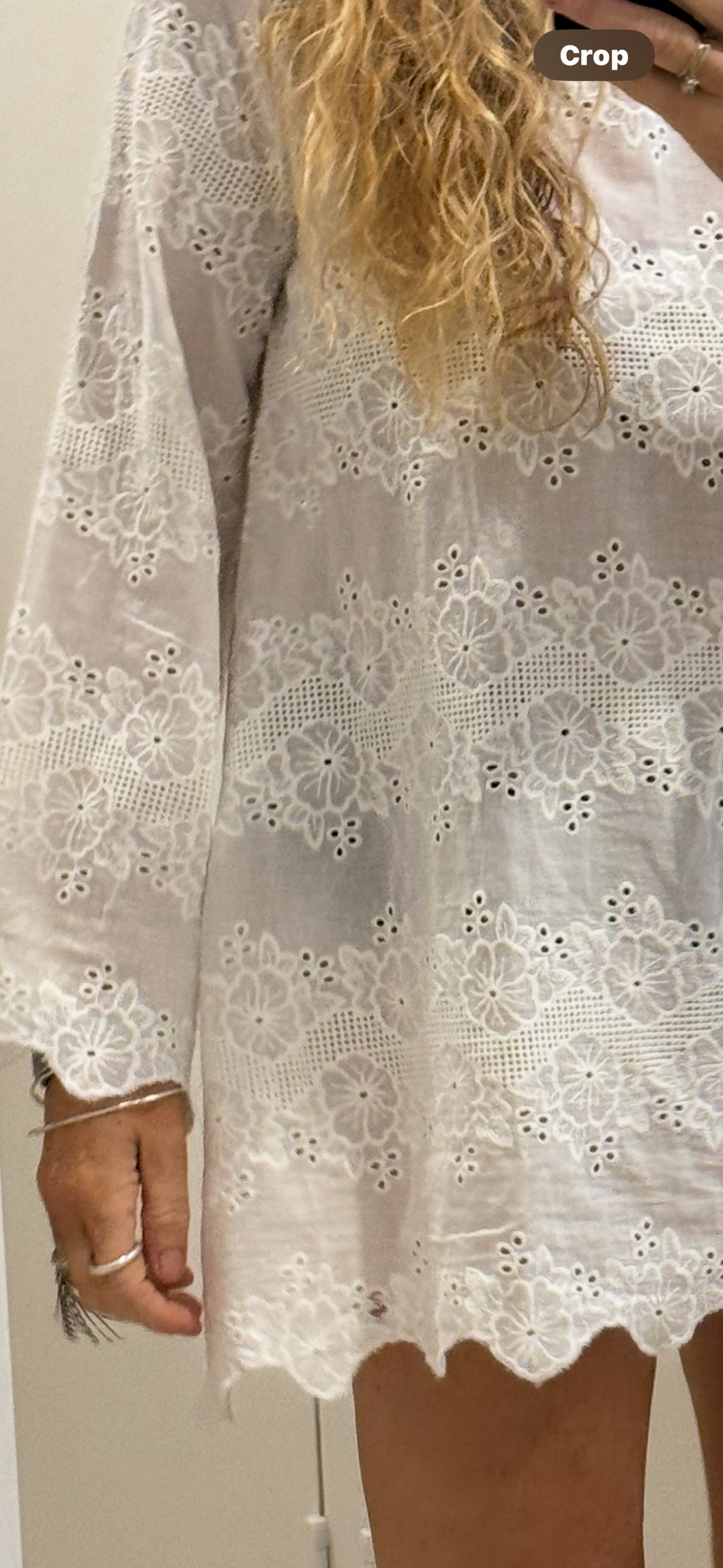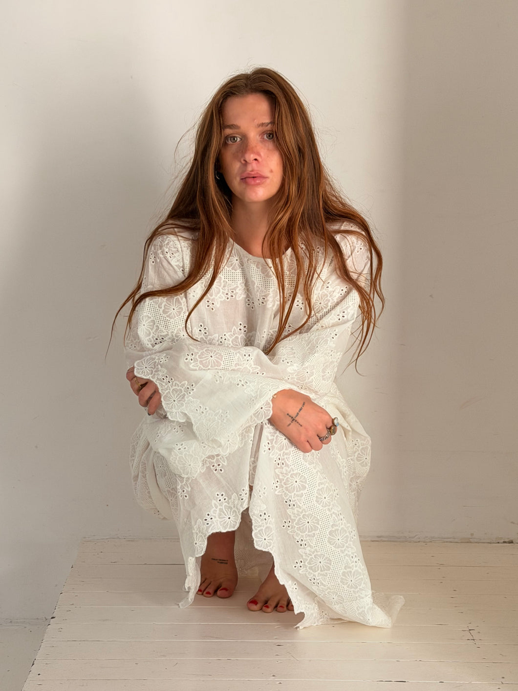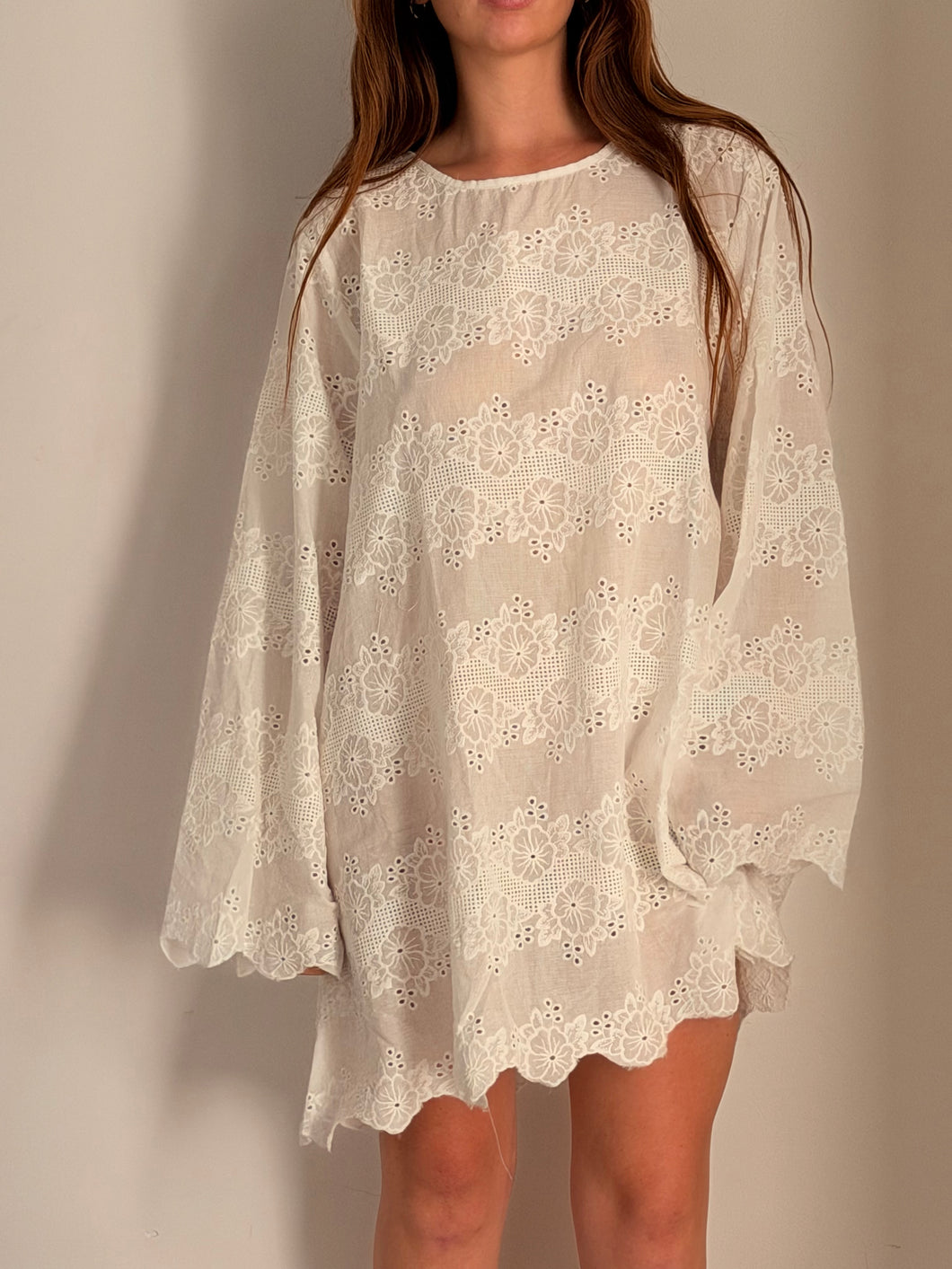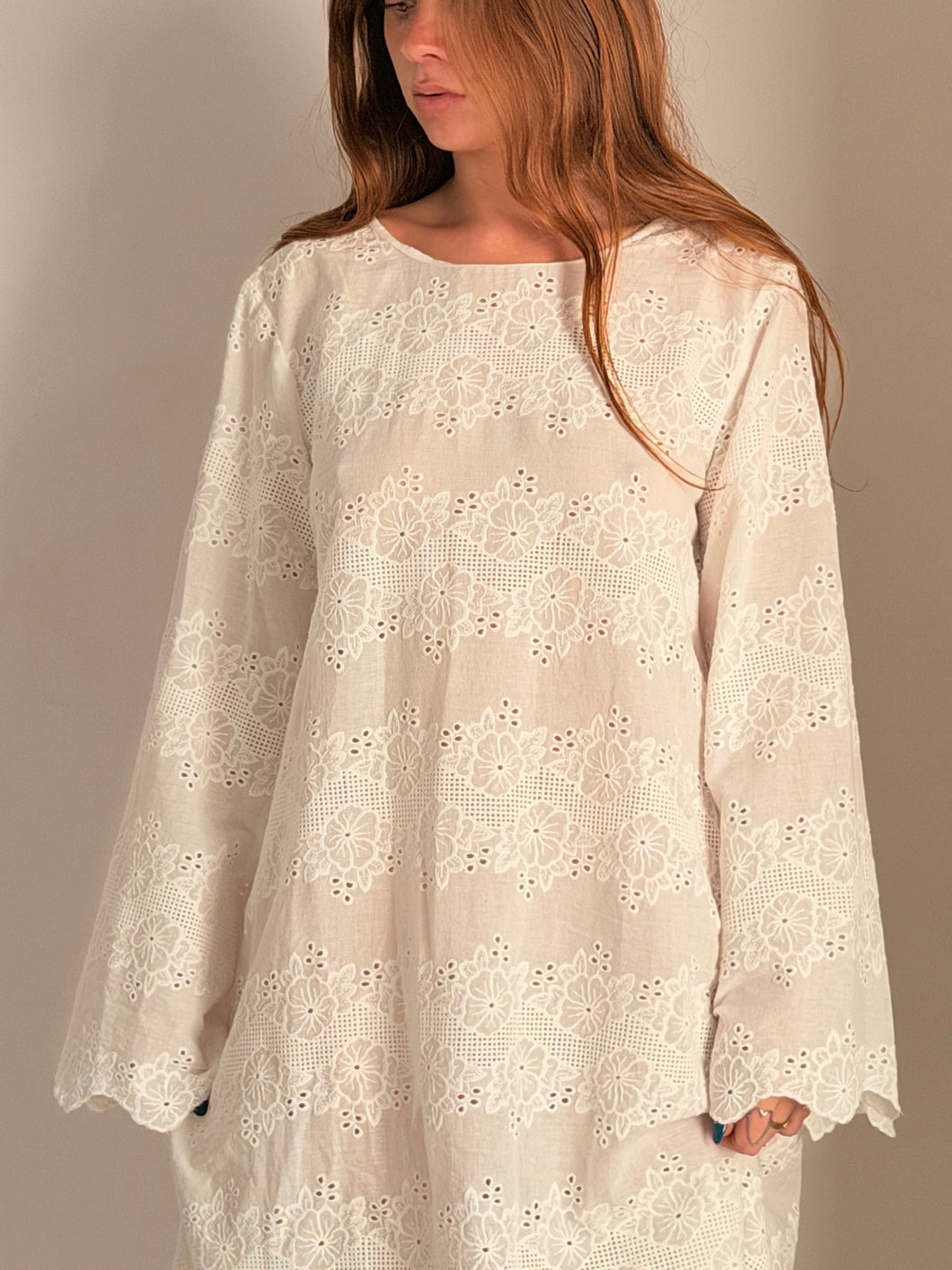 Long 70 style sleeve, beautiful broderie detail in the fabric, round neckline with Wilde sleeve ...