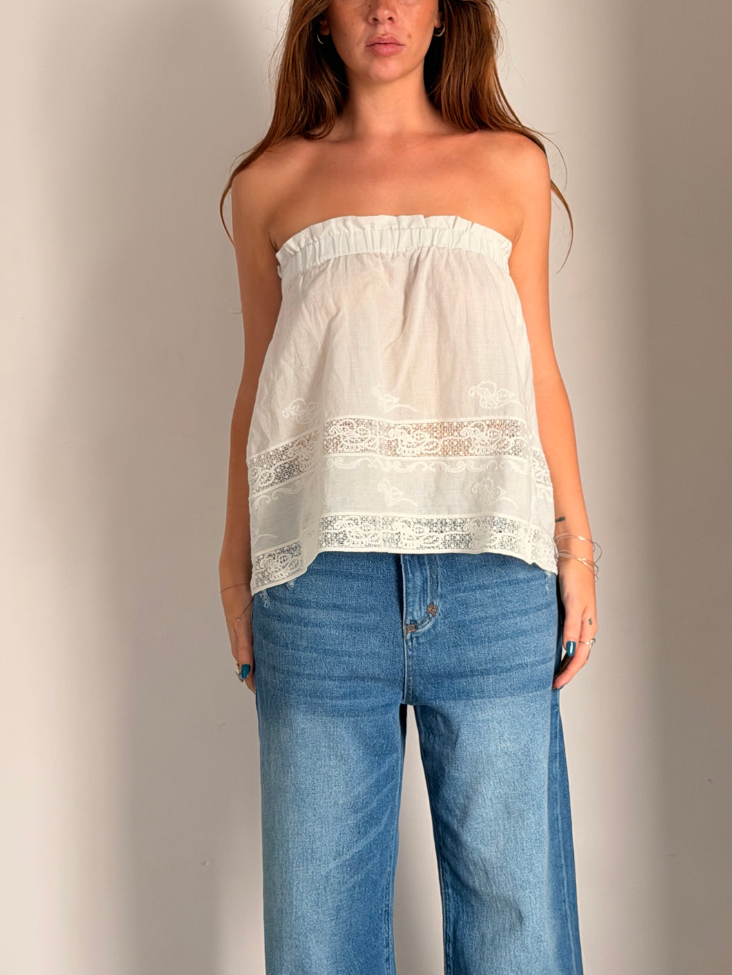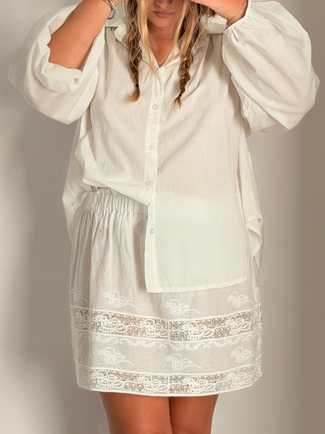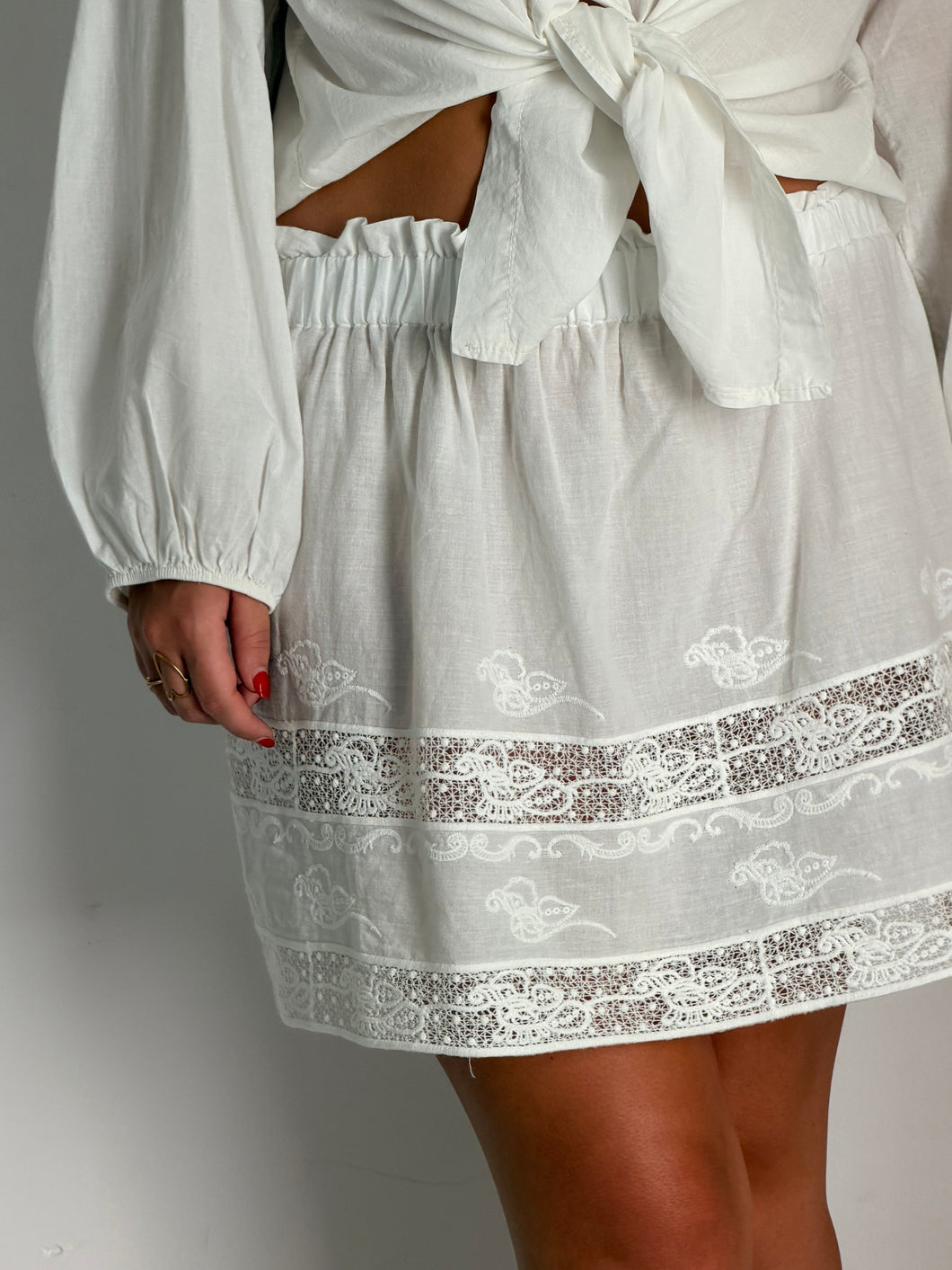 the luna mini skirt cotton and fine lace broderie. Can wear it like a mini skirt or also as a top.. Elastic waist.. 30cm..