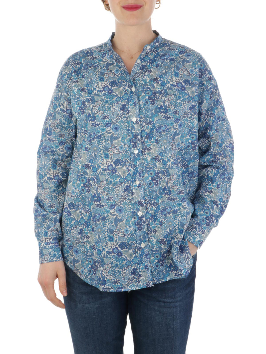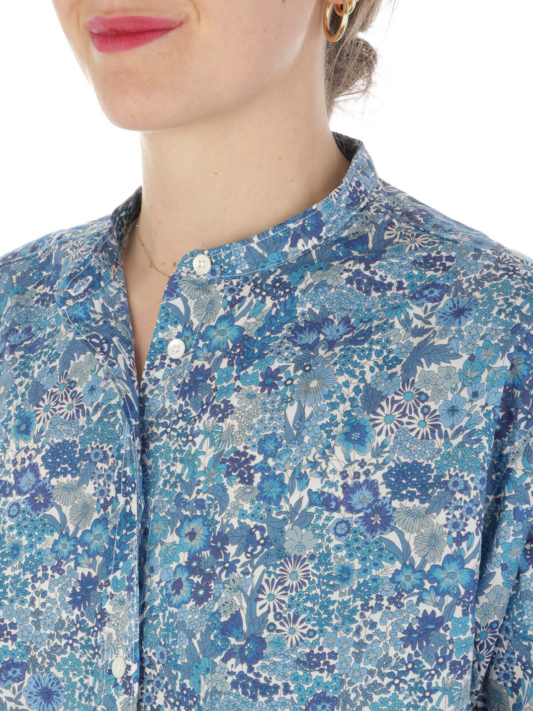 Front button fastening, mandarin collar, allover liberty printed pattern, absolutely love this with a denim pants