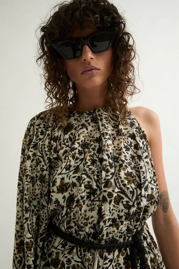 The Kerala dress is asymmetrical in black and cream floral print, with a long puffed sleeve, a waist cinched by a braided belt with pompoms...