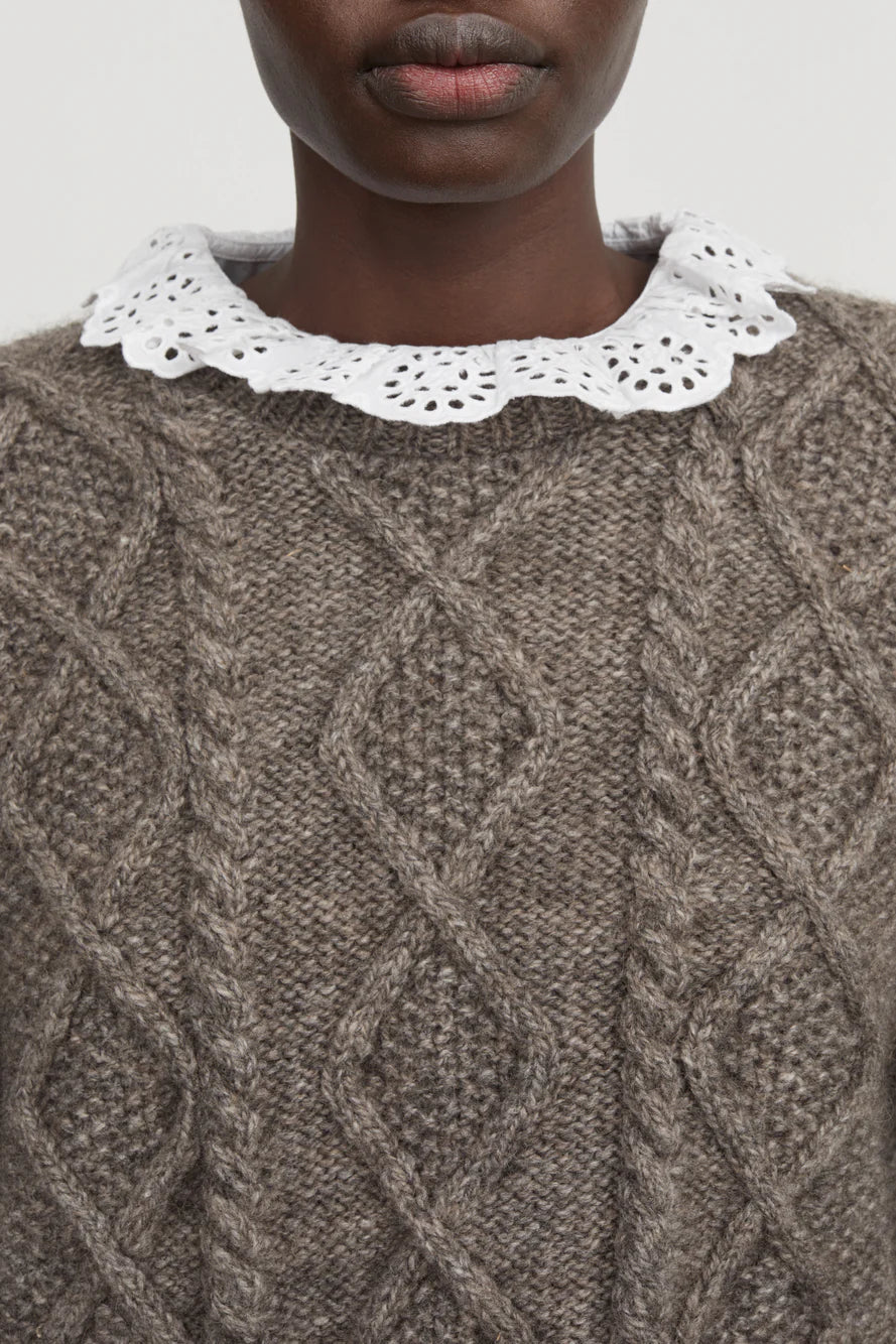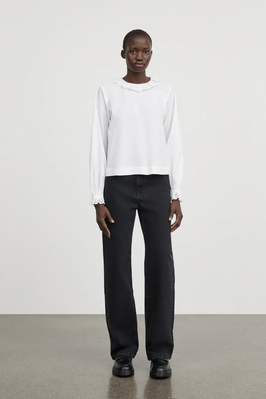 Cornflower blouse is a blouse in organic cotton poplin. The blouse has a round neck with a small, lace collar and closes all the way down with buttons in the back. The sleeves have a bit of volume and are detailed with an elastic cuff with a lace trim.