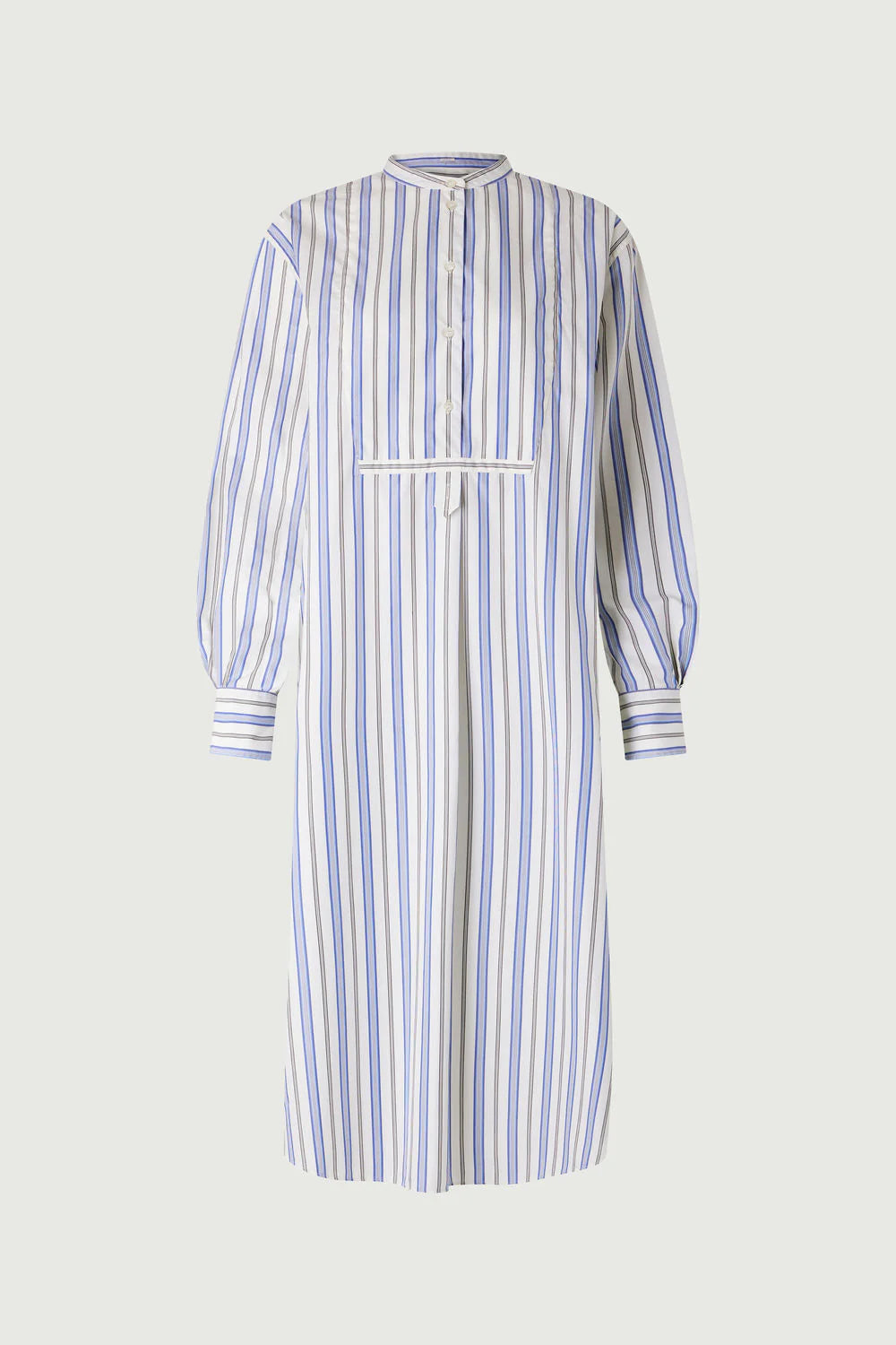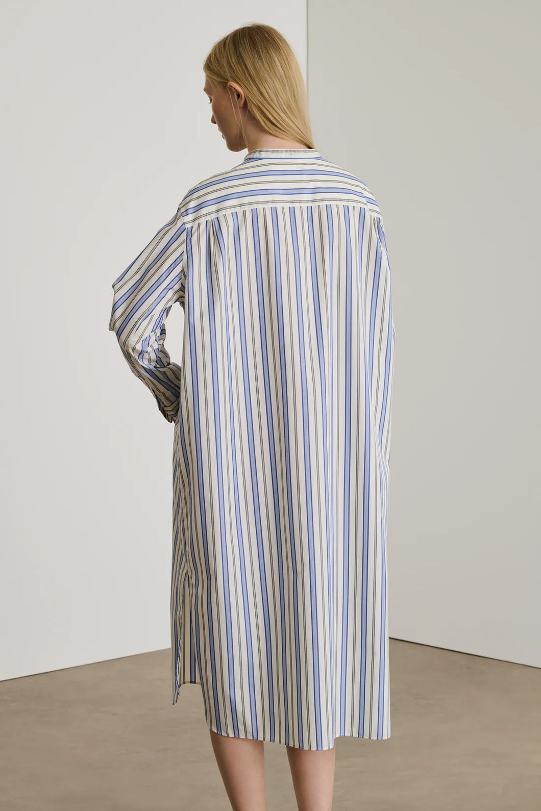 loose oversized midi dress with a stand-up collar, and a chest yoke
