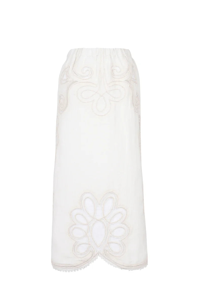 organic cotton and linen long skirt stands out for its chic romantic style thanks to hand-embroidered lace details bringing a refined and luxurious side